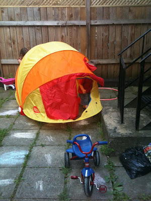 Otro momento muy excitante: probar la tienda de playa (con protection UVA)… ¡después de que papá se haya enfadado un poco para montarla!